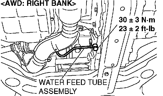 4. Drain the water in the water jacket by unplugging the drain plug of the cylinder block. For the right bank side on AWD vehicles, drain the engine coolant from the water feed tube assembly of the transfer box.
