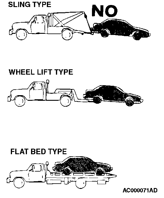 CAUTION: This vehicle cannot be towed by a wrecker using sling-type equipment; otherwise the bumper may become deformed. If this vehicle is towed, use wheel lift or flat bed equipment.