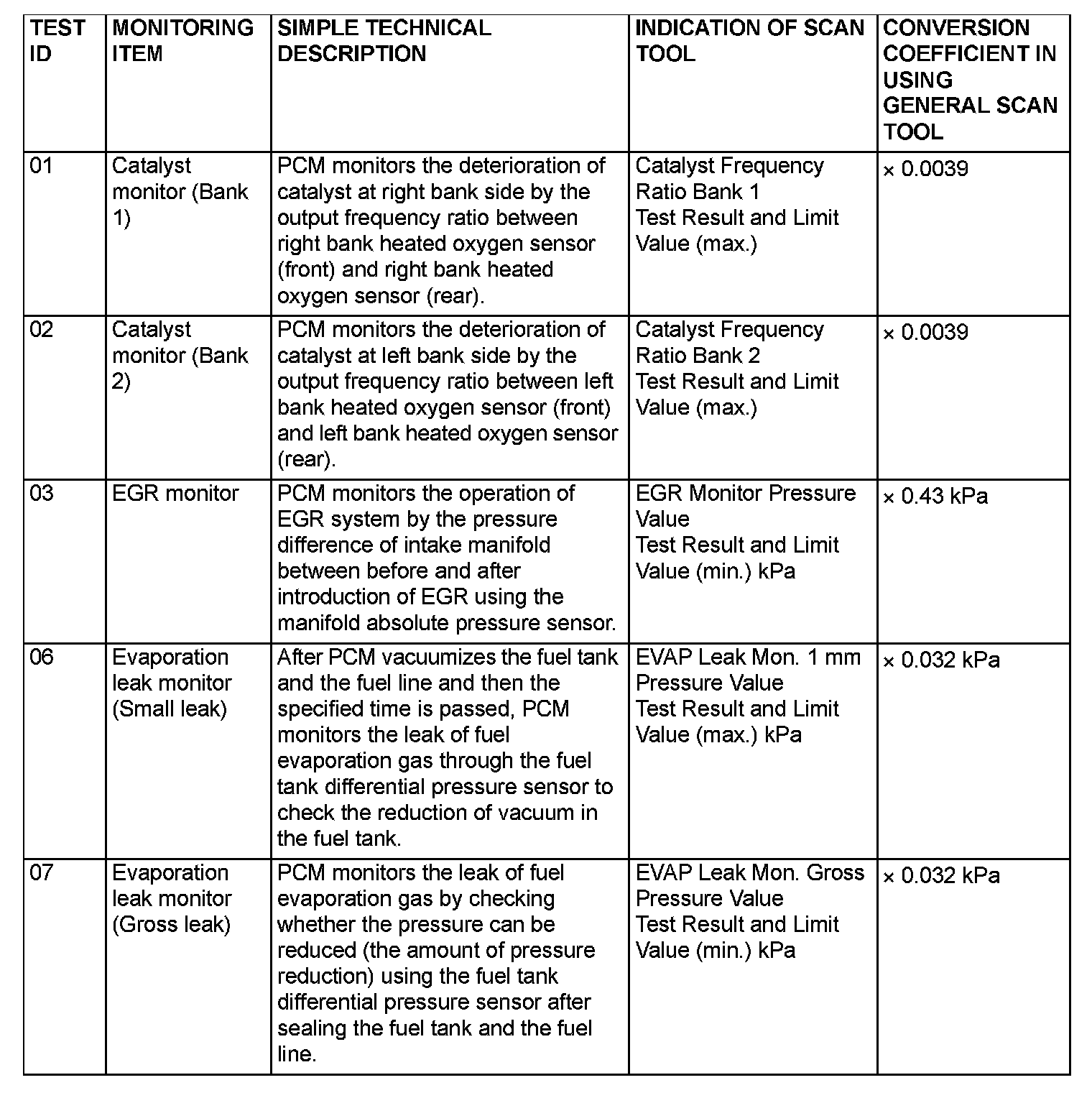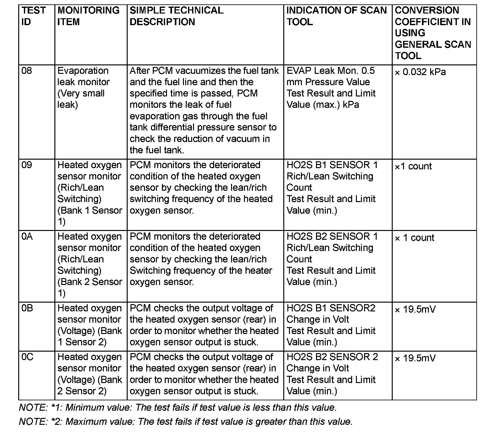 By selecting MODE 6 using scan tool, Test Result and Limit Value (minimum) *1 or (maximum) *2 about the main items of emission control system which PCM monitors can be confirmed. The value at the last monitoring is output by PCM as a test result.