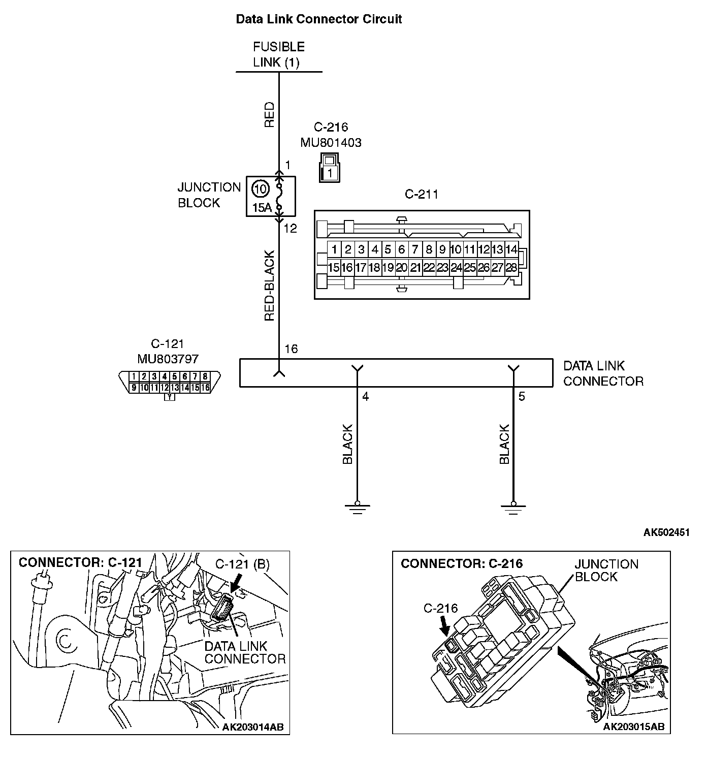 NO: Check harness connectors C-211 C-216 at intermediate connector for damage and repair or replace as required. If intermediate connector C-211 C-216 are in good condition repair an open circuit between fusible link (1) and data link connector C-121 (terminal No.16). Then confirm that the malfunction symptom is eliminated.