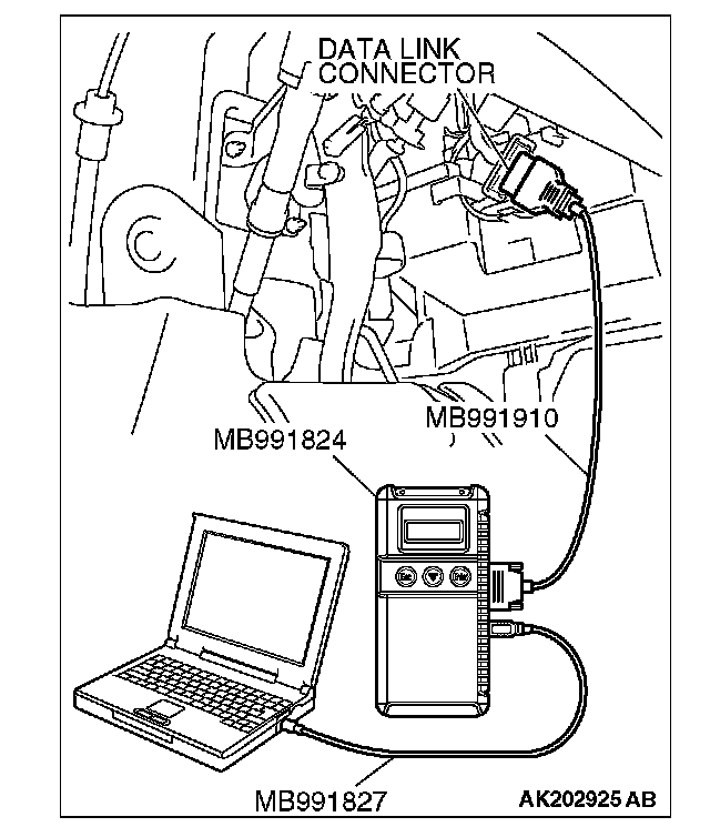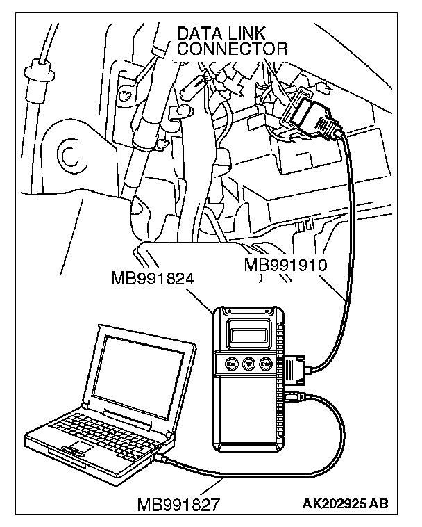 CAUTION: To prevent damage to scan tool MB991958, always turn the ignition switch to the "LOCK" (OFF) position before connecting or disconnecting scan tool MB991958.