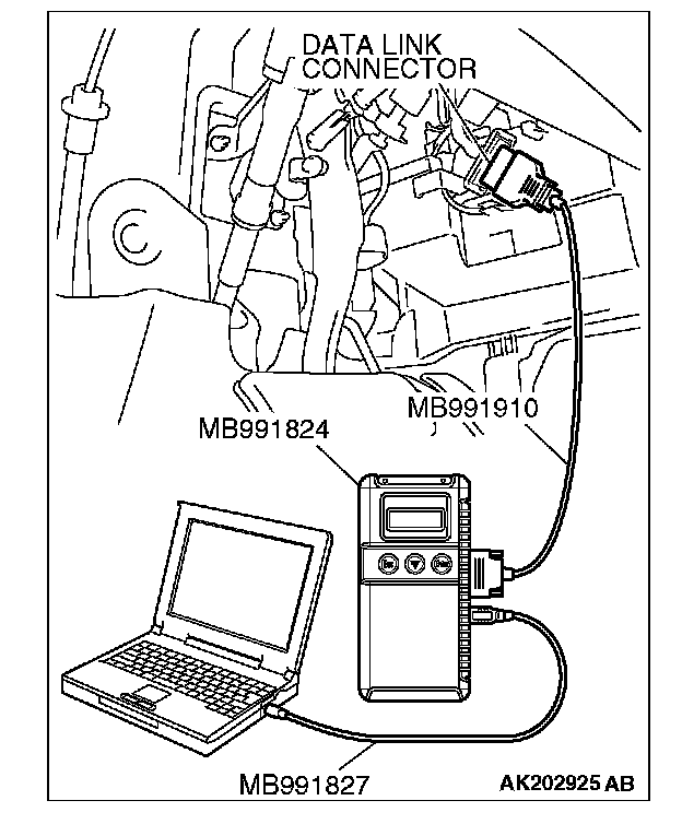 CAUTION: To prevent damage to scan tool MB991958, always turn the ignition switch to the "LOCK" (OFF) position before connecting or disconnecting scan tool MB991958.