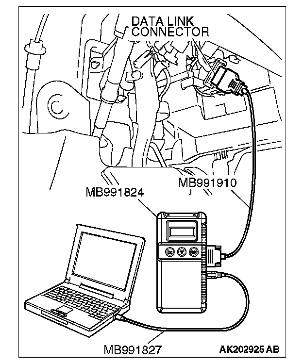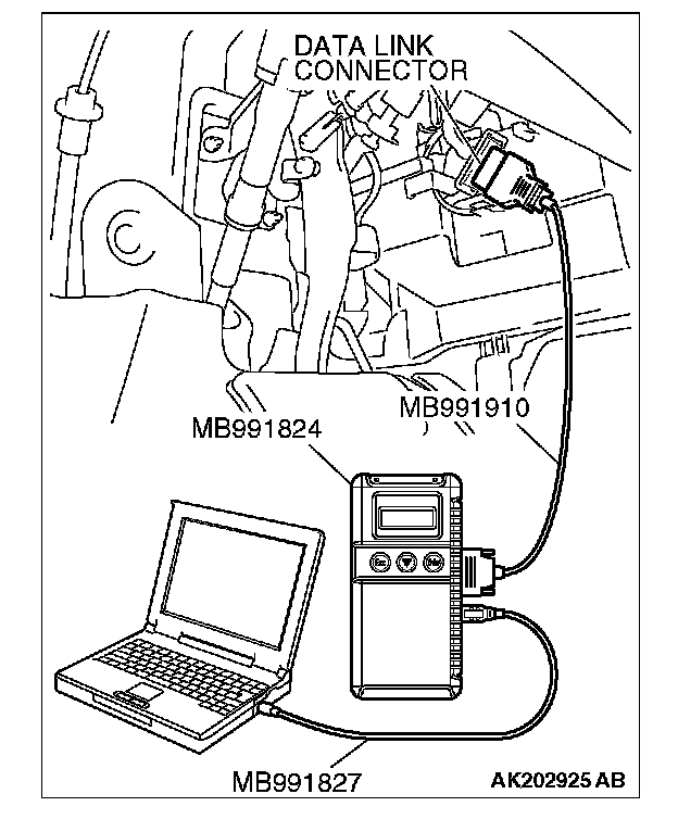 CAUTION: To prevent damage to scan tool MB991958, always turn the ignition switch to the "LOCK" (OFF) position before connecting or disconnecting scan tool MB991958.