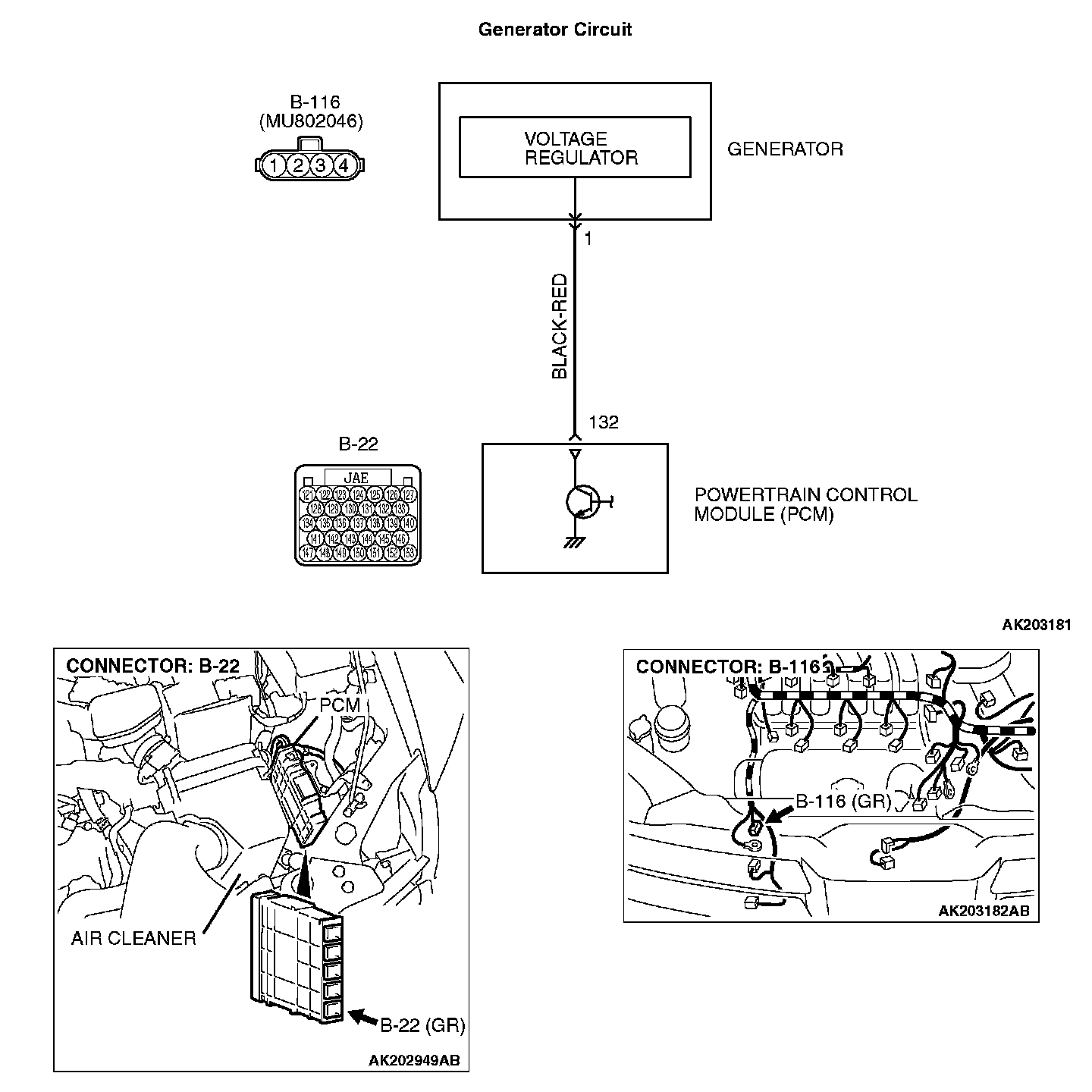 STEP 3. Check for open circuit and short circuit to ground and harness damage between generator connector B-116 (terminal No. 1) and PCM connector B-22 (terminal No. 132).