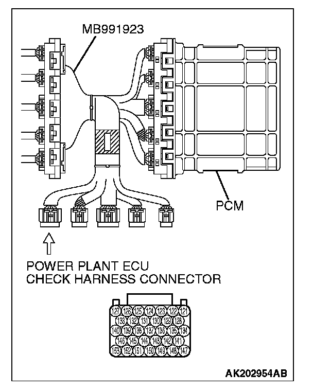 1. Disconnect the all PCM connectors and connect check harness special tool MB991923 between the separated connectors.