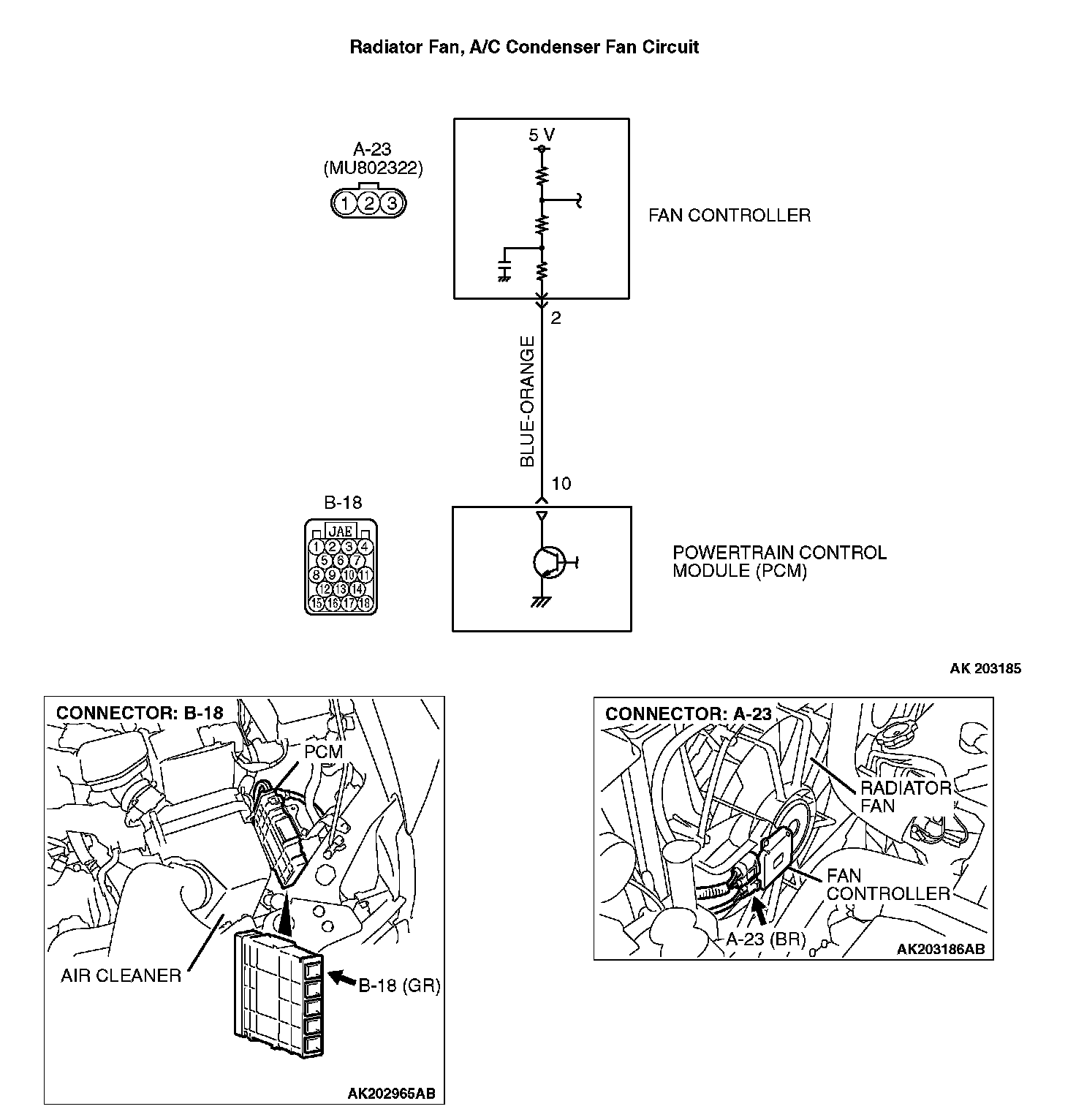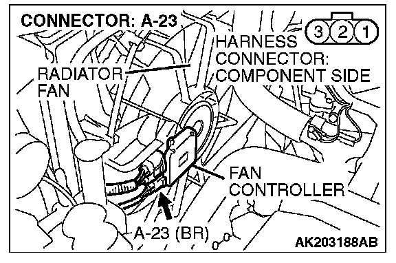 STEP 3. Check for open circuit and short circuit to ground and harness damage between fan controller A-23 (terminal No. 2) and PCM connector B-18 (terminal No. 10).