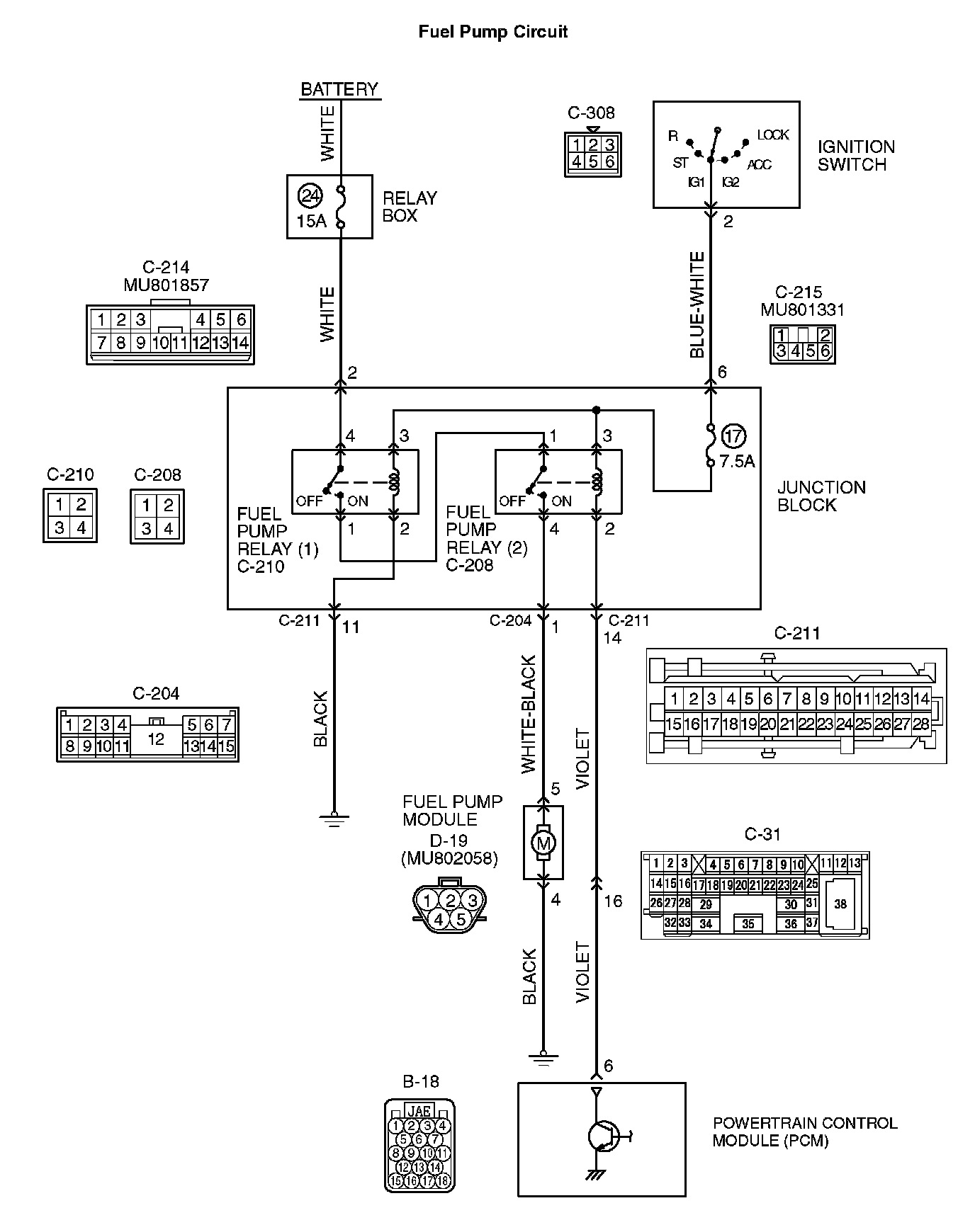 - Battery positive voltage is applied to the fuel pump relay 1 (terminal No. 3) from the ignition switch-IG. Ground is provided through terminal No. 4 to chassis ground.