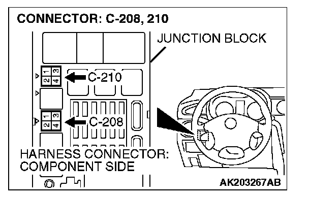 STEP 2. Check harness connector C-210 at fuel pump relay 1 and harness connector C-208 at fuel pump relay 2 for damage.