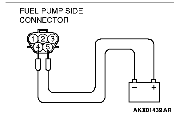 2. Use jumper wires to connect fuel pump connector terminal No. 5 to the positive battery terminal and terminal No. 4 to the negative battery terminal.