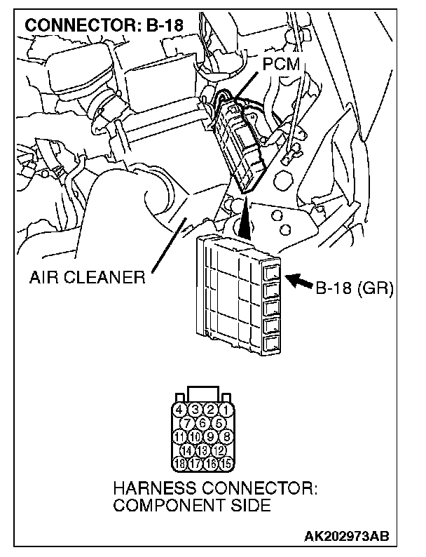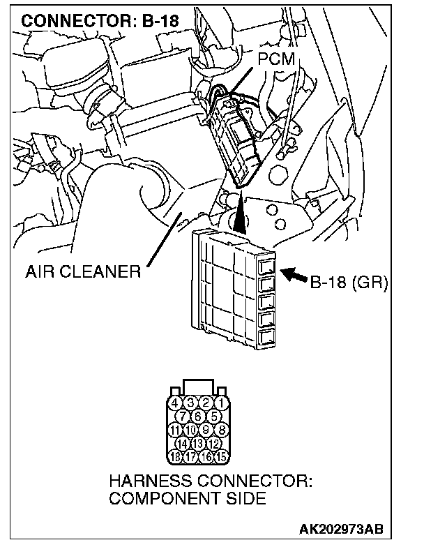 STEP 13. Check harness connector B-18 at PCM for damage.