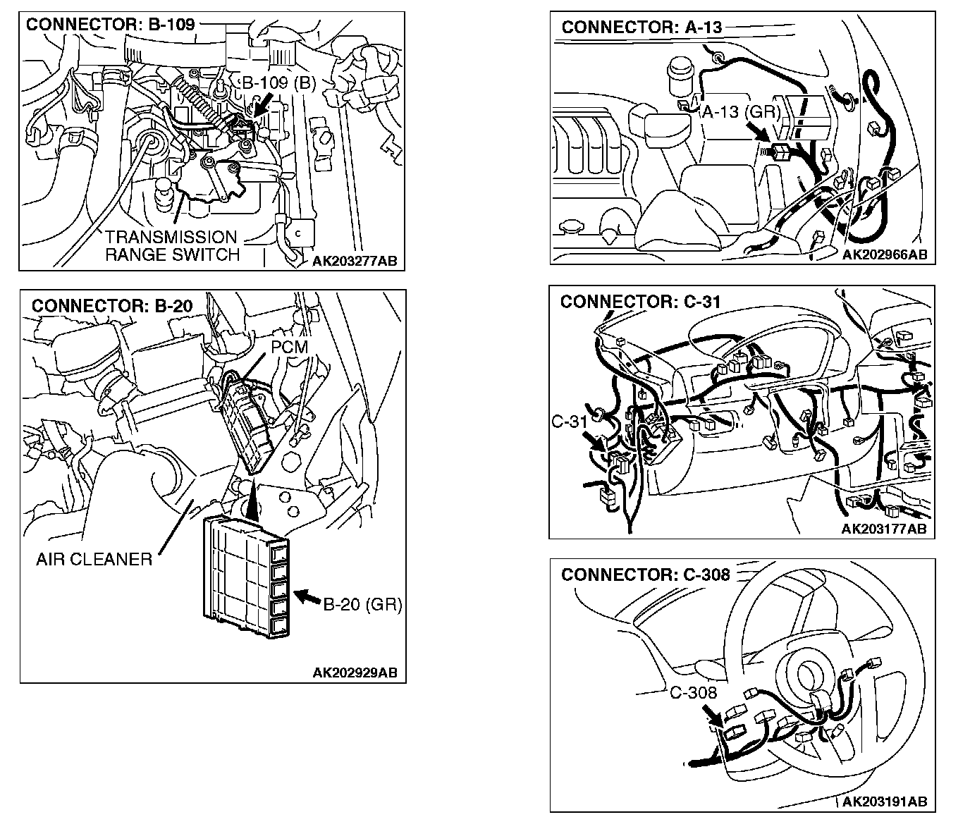 NO: Check connector A-13 and C-31 at intermediate connector for damage, and repair or replace as required. If intermediate connector are in good condition, repair harness wire between ignition switch connector C-308 (terminal No. 5) and transmission range switch connector B-109 (terminal No. 10) because of open circuit. Then confirm that the malfunction symptom is eliminated.
