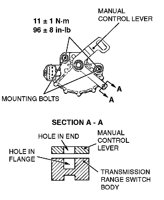 4. Loosen the transmission range switch body mounting bolts and turn the transmission range switch body so the hole in the end of the manual control lever and the hole (section A-A in the figure on the left) in the flange of the transmission range switch body flange are aligned.