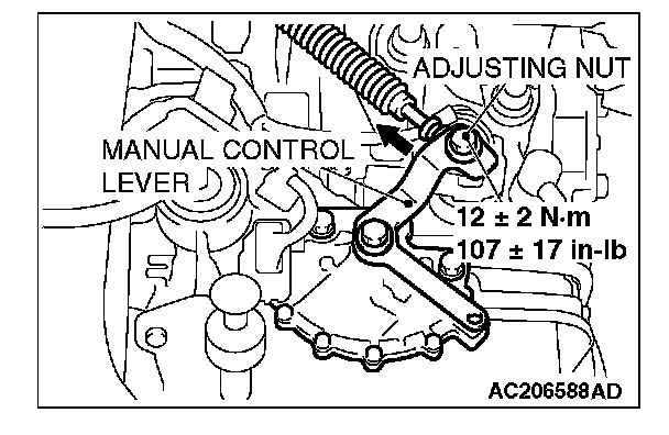 6. Gently push the transaxle control cable in the direction of the arrow, until the cable is taut. Tighten the adjusting nut.