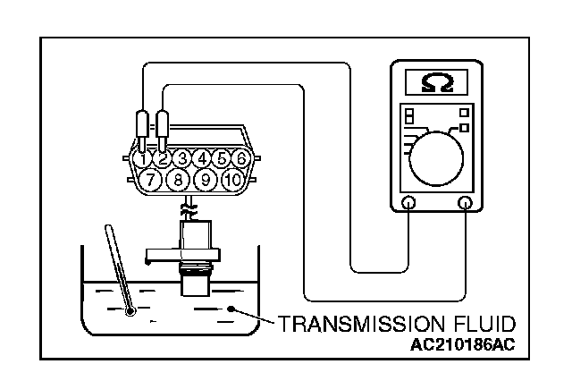 2. Measure the resistance between terminals 1 and 2 of the transmission fluid temperature sensor connector.