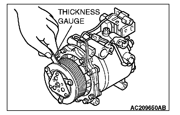 Apply voltage from the battery to the air conditioning compressor clutch and check that the clutch air gap is inside the standard value. If outside the standard value, use a shim to adjust the gap.