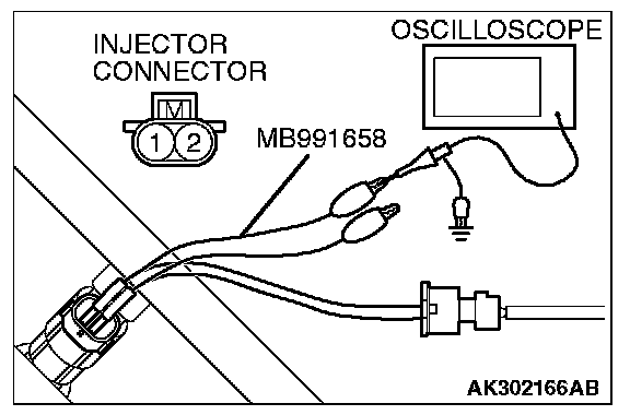 1. Disconnect the injector connector, and connect the test harness special tool (MB991658) between the separated connector. (All terminals should be connected.)