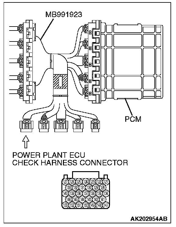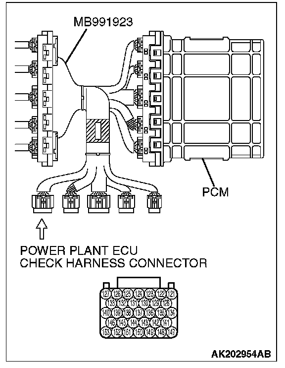 1. Disconnect all PCM connectors. Connect the check harness special tool (MB991923) between the separated connectors.