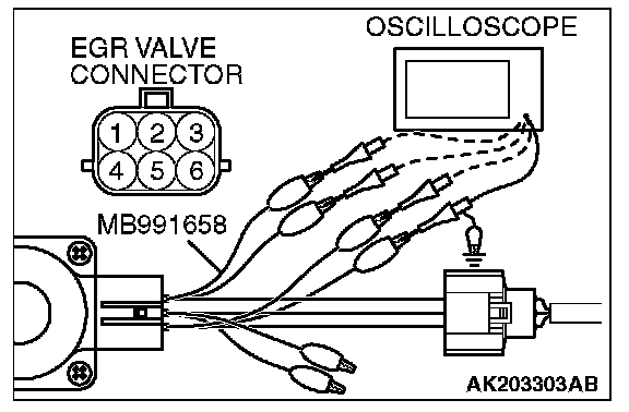 2. Connect the oscilloscope probe to the EGR valve connector terminal No. 1, terminal No. 3, terminal No. 4, terminal No. 6 respectively.