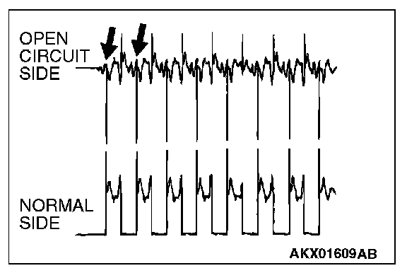 - Current is not supplied to the motor coil on the open circuit side. (Voltage does not drop to 0 volt.) Furthermore, the induced electromotive force wave pattern at the normal side is slightly different from the normal wave pattern.
