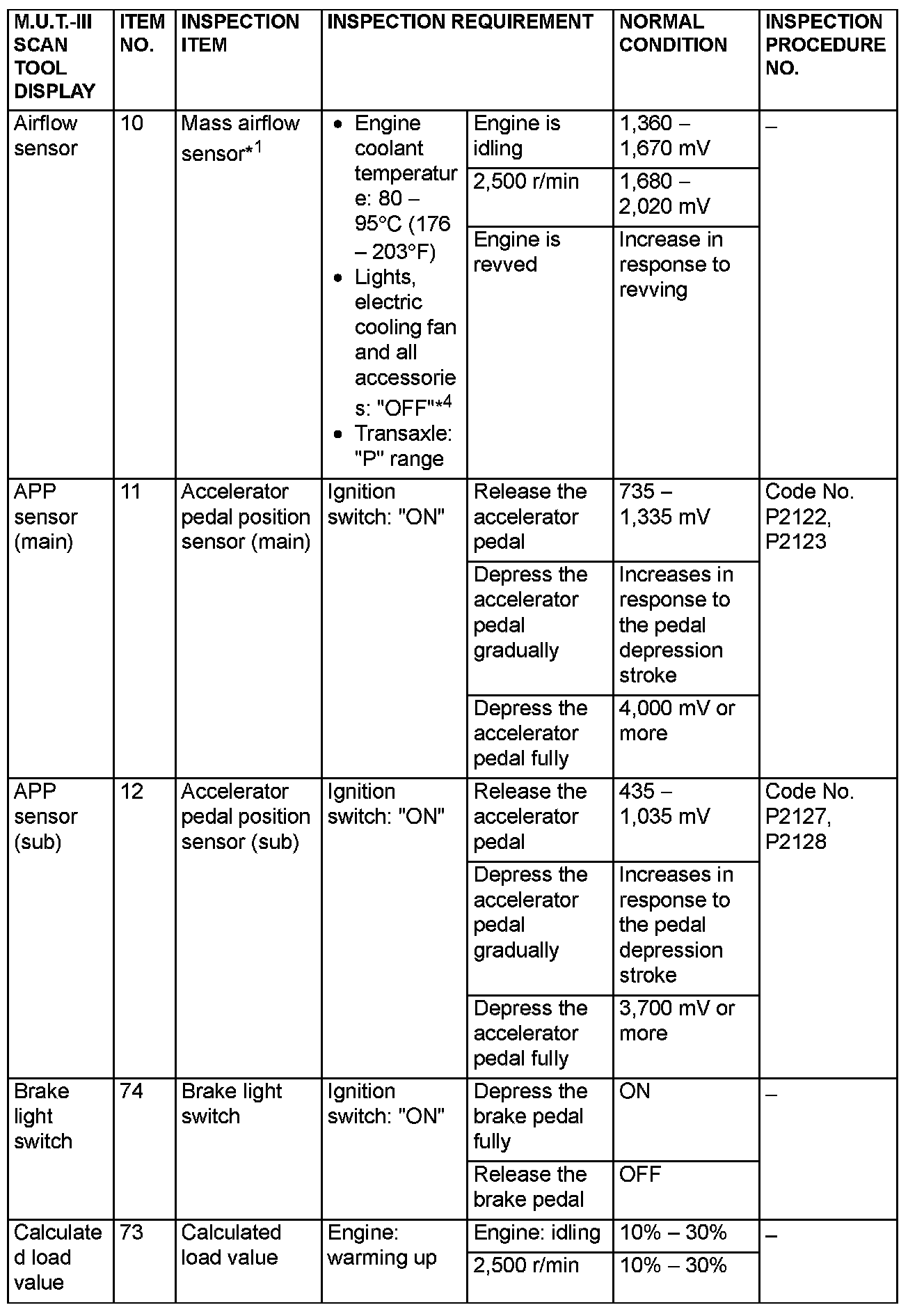 NOTE: *1: In a new vehicle [driven approximately 500 km (311 mile) or less], the mass airflow sensor output value is sometimes 10% higher than the standard value.