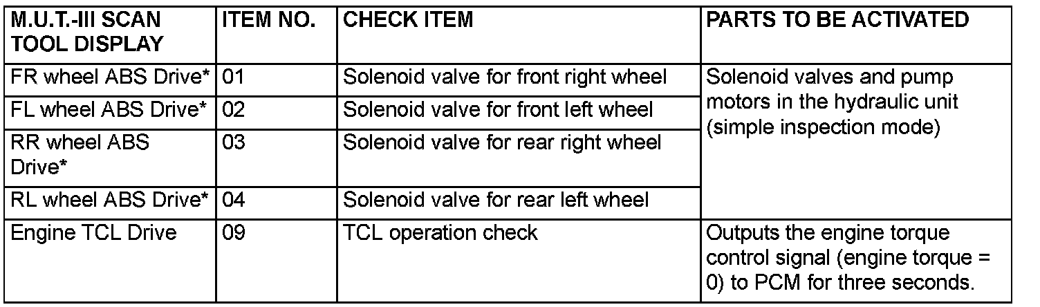 NOTE: Since the TCL is controlled with the same ABS/TCL-ECU used to control the ABS, the FR, FL, RR or RL Wheel ABS Drive testing items (No.01 to 04) used only for the ABS also appear.