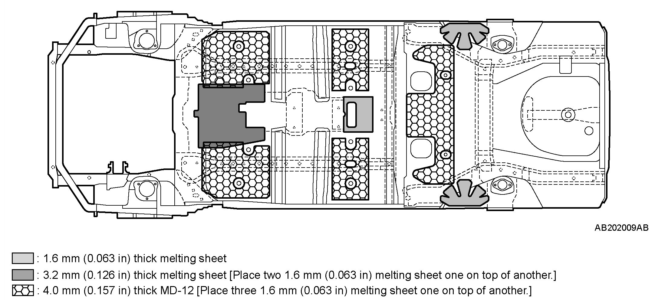 SILENCER APPLICATION LOCATIONSA silencer (MD-12 and melting sheet) has been adhered on the top part of the floor to improve anti- vibration performance and to shut-out exhaust gas heat.