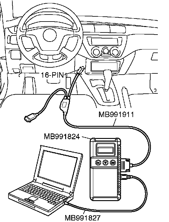 CAUTION: To prevent damage to scan tool MB991958, always turn the ignition switch to the "LOCK" (OFF) position before connecting or disconnecting scan tool MB991958.