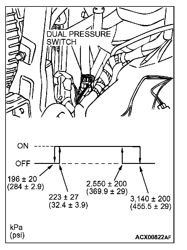 3. When the high/low pressure sides of the dual pressure switch are at operation pressure (ON) and there is continuity between the respective terminals, then the condition is normal. If there is no continuity, replace the switch.