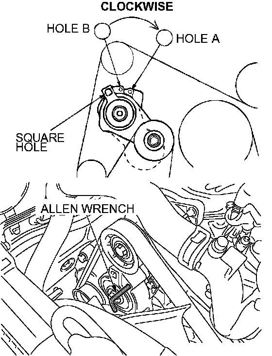 2. After the drive belt has been installed, remove the Allen wrench while holding the drive belt auto tensioner with a socket wrench drive. Then release the drive belt auto tensioner slowly.