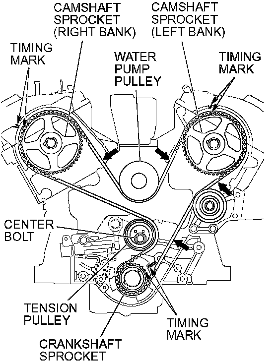 3. Turn the camshaft sprocket counterclockwise until the tension side of the timing belt is firmly stretched. Check all timing marks again.