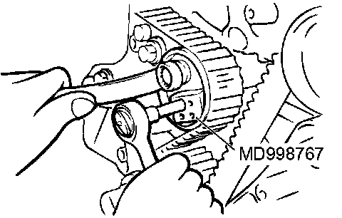 4. Use special tool MD998767 to push the tensioner pulley into the timing belt, and then temporarily tighten the center bolt.