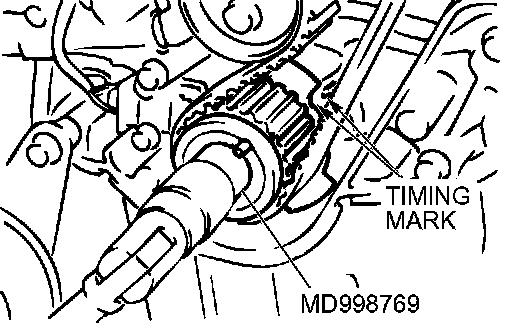 5. Use special tool MD998769 to turn the crankshaft 1/4 turn counterclockwise and then turn it again clockwise until the timing marks are aligned.