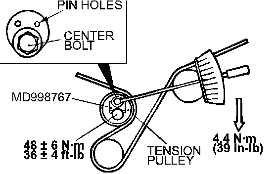 6. Loosen the center bolt of the tensioner pulley. Use special tool MD998767 and a torque wrench to apply the standard torque to the timing belt as shown in the illustration. Then tighten the center bolt to the specified torque.