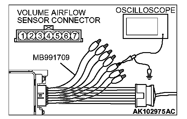 1. Disconnect the volume airflow sensor connector, and connect the test harness special tool (MB991709) in between. (All terminals should be connected.)