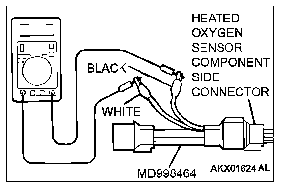 1. Disconnect the heated oxygen sensor connector and connect special tool MD998464 to the connector on the heated oxygen sensor side.