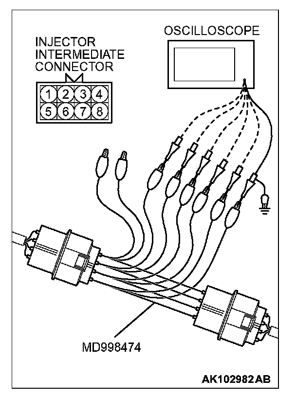 1. Disconnect the injector intermediate connector, and connect the test harness special tool (MD998474) in between.