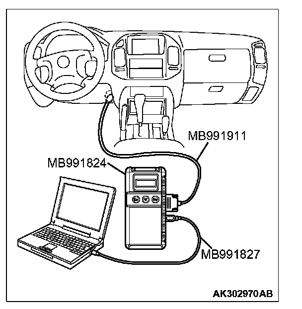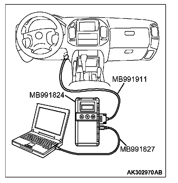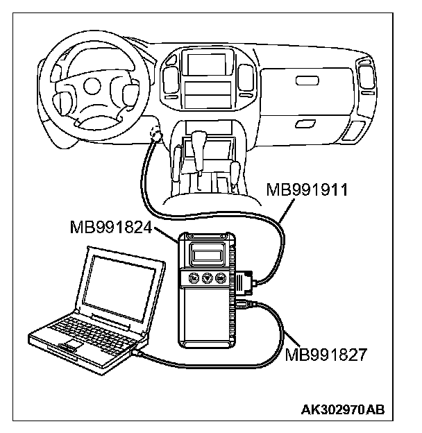 CAUTION: To prevent damage to scan tool MB991958, always turn the ignition switch to the "LOCK" (OFF) position before connecting or disconnecting scan tool MB991958.