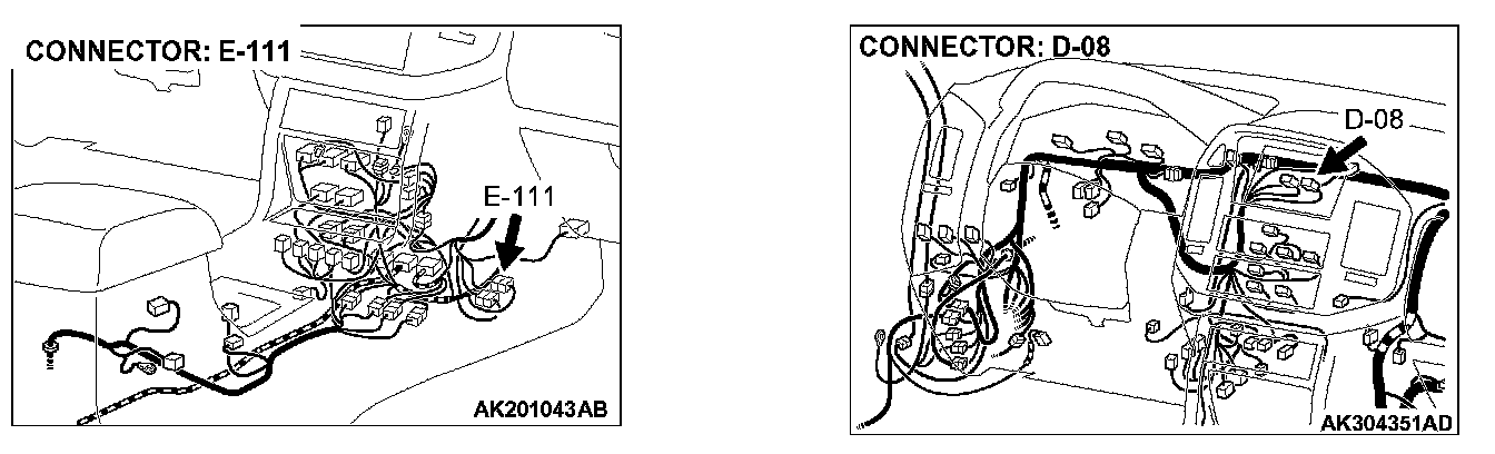 NOTE: Check harness after checking intermediate connectors D-08 and E-111. If intermediate connectors D-08 and E-111 are damaged, repair or replace them. Refer to Harness Connector Inspection. Then confirm that the malfunction symptom is eliminated.