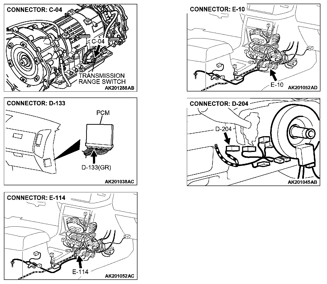 STEP 5. Check for open circuit and short circuit to ground and harness damage between transmission range switch connector C-04 (terminal No.9) and PCM connector D-133 (terminal No.51).
