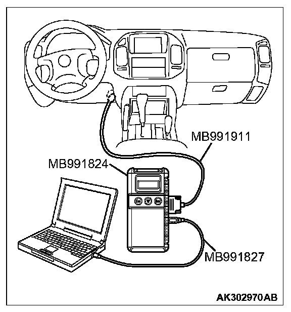CAUTION: To prevent damage to scan tool MB991958, always turn the ignition switch to the "LOCK" (OFF) position before connecting or disconnecting scan tool MB991958.