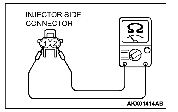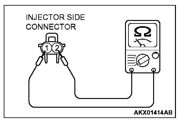 3. Measure the resistance between injector side connector terminal No.1 and No.2.