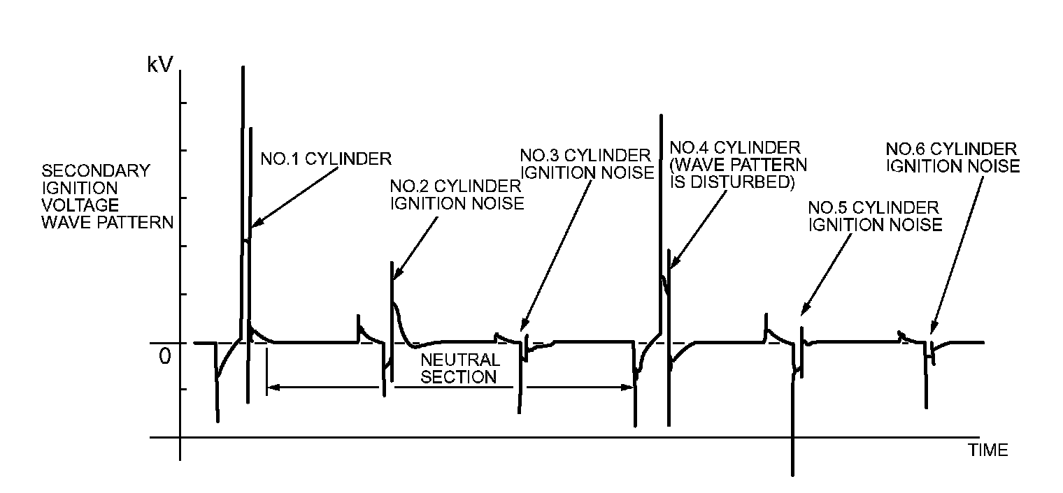 NOTE: Because of the two-cylinder simultaneous ignition system, the waves for two cylinders in each group appear during wave observation. However, wave observation is carried out for the cylinder (Number 1, 3 or 5) with the spark plug cable which has been clamped by the secondary pickup.