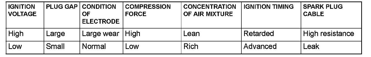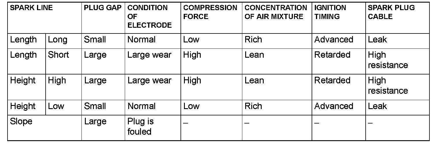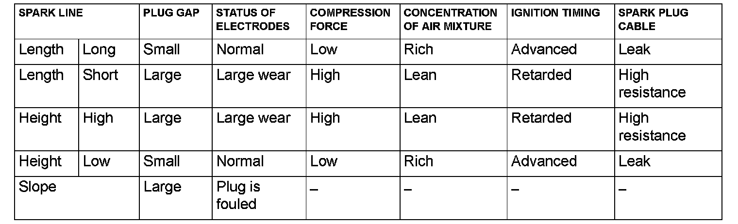 The height, length and slope of the spark line (refer to abnormal waveform examples 1, 2, 3 and 4) show the following trends.