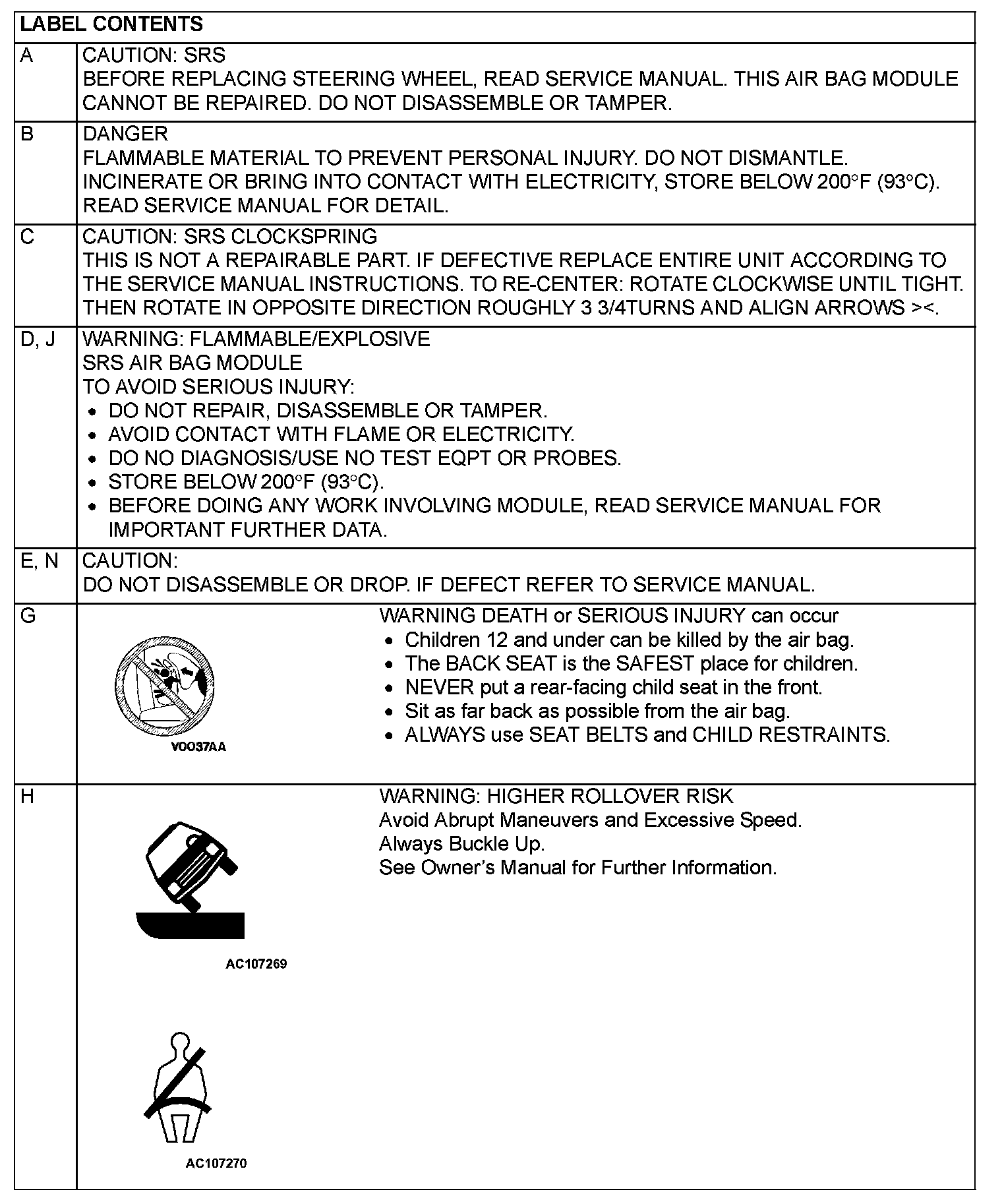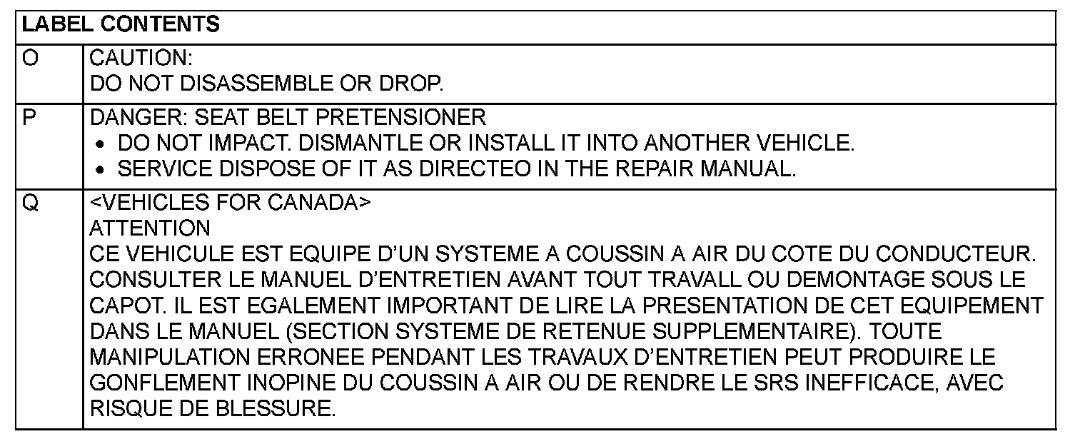 WARNING/CAUTION LABELSA number of caution labels related to the SRS are found in the vehicle, as shown in the illustration. Follow label instructions when servicing SRS. The label L is not to be removed except by owner. If the other labels are dirty or damaged, replace them.