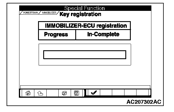 Operate two registered ignition keys by the following procedure, call additional registration mode for the immobilizer-ECU, then register an additional ignition key by operating it. Additional ignition keys can be registered without using the MUT-III by operating two ignition keys that already have been registered to the vehicle and operating an additional key to be registered (A maximum of eight ignition keys can be registered).