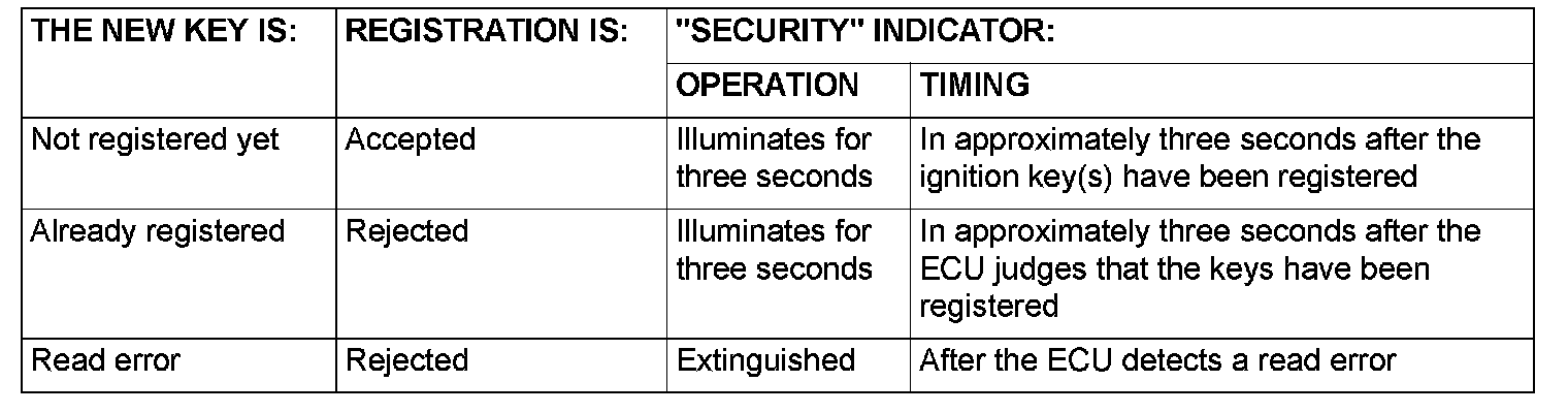7. The immobilizer-ECU identifies the new key to accept or reject it, and operates the "SECURITY" indicator (See the table).