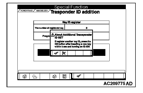 6. If an additional registration is made successfully, the screen will ask if another key is registered or not. If the third ignition key is registered, remove the key, which has been registered. Then insert the third key within five seconds, and then turn it to the ON position.