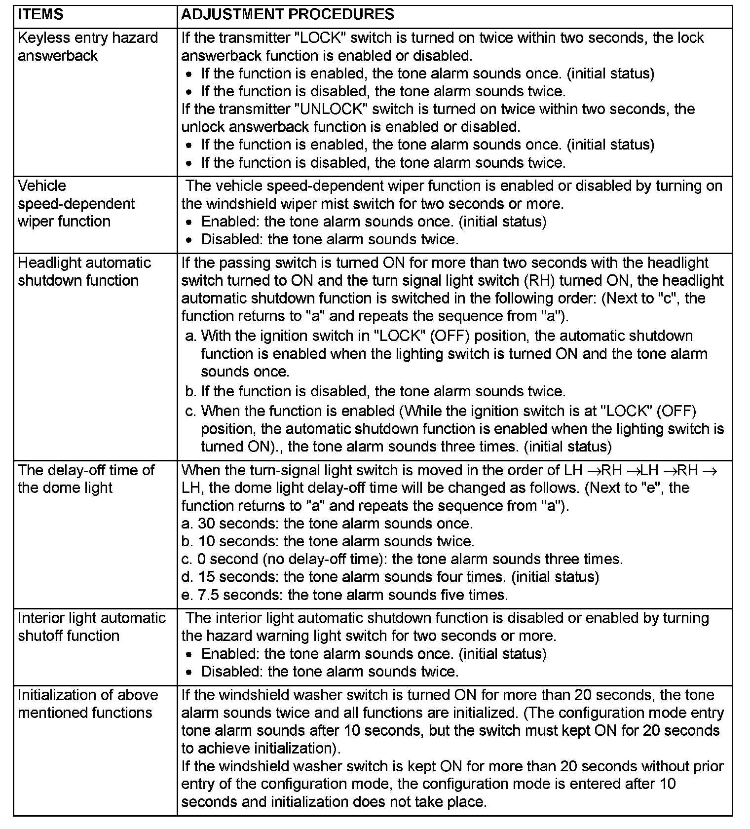 NOTE: The keyless entry hazard answerback can be also adjusted by operating the keyless entry transmitter. (however, this adjustment can be done more easily by operating the transmitter). Refer to How to Register Secret Code in Keyless Entry.