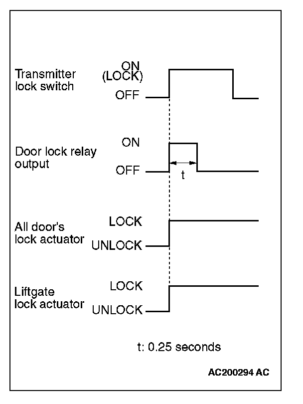 When the transmitter lock switch is pressed, the ETACS-ECU energizes its door lock relay to operate all the door lock actuators for 0.25 second thus causing all doors and the liftgate to be locked.