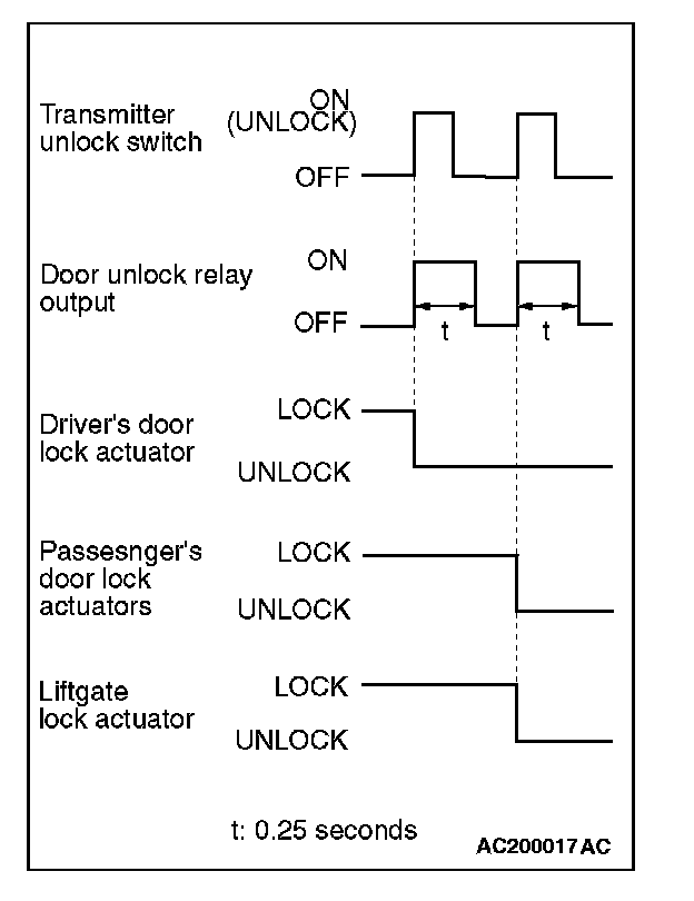 When the transmitter unlock switch is pressed twice, the ETACS-ECU energizes its door unlock relay to operate the driver's door lock actuator and the other door lock actuators for 0.25 seconds each in succession. Then, the doors and the lift-gate will be unlocked.